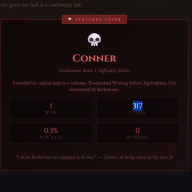 "I think Barbarians are supposed to do that." — Conner, on being wiped out by turn 20